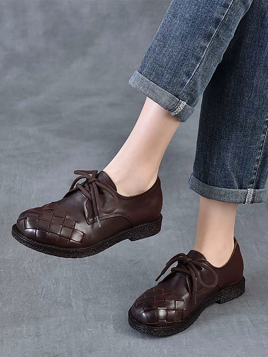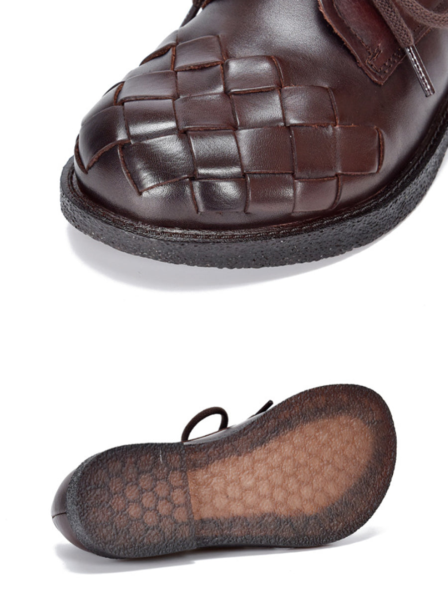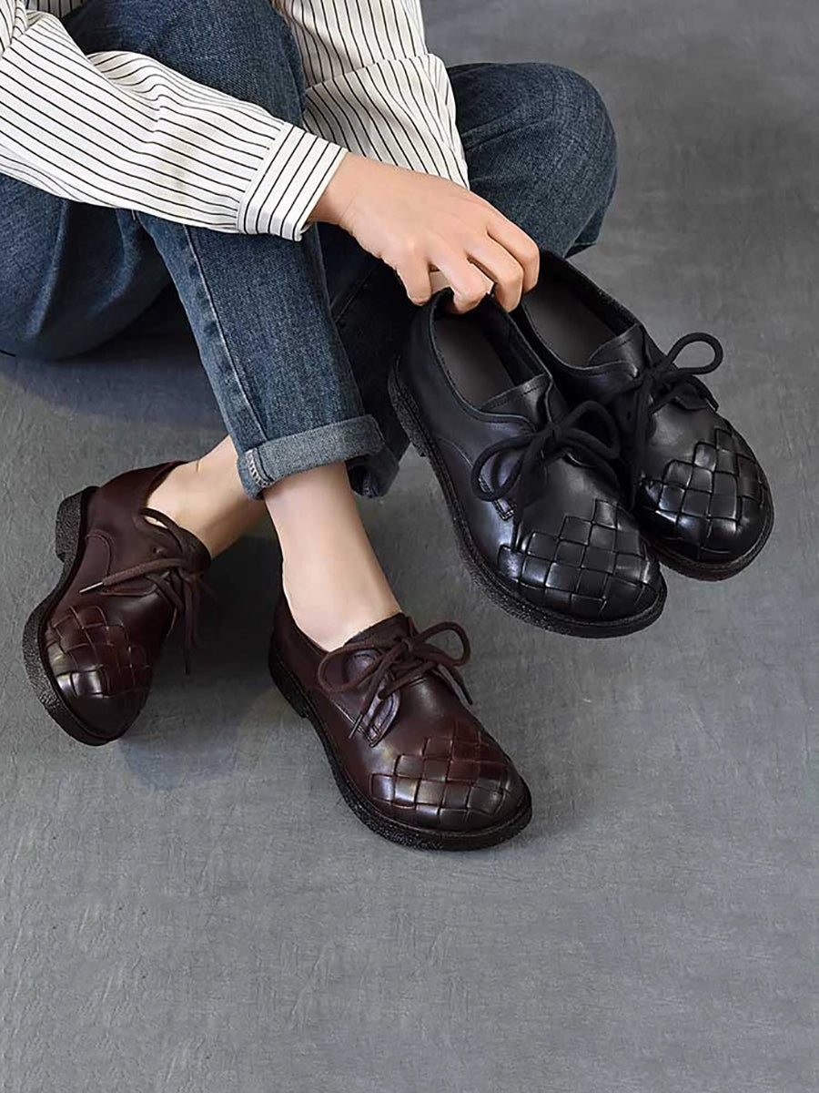 Sapatos femininos vintage de couro genuíno trançado com salto baixo