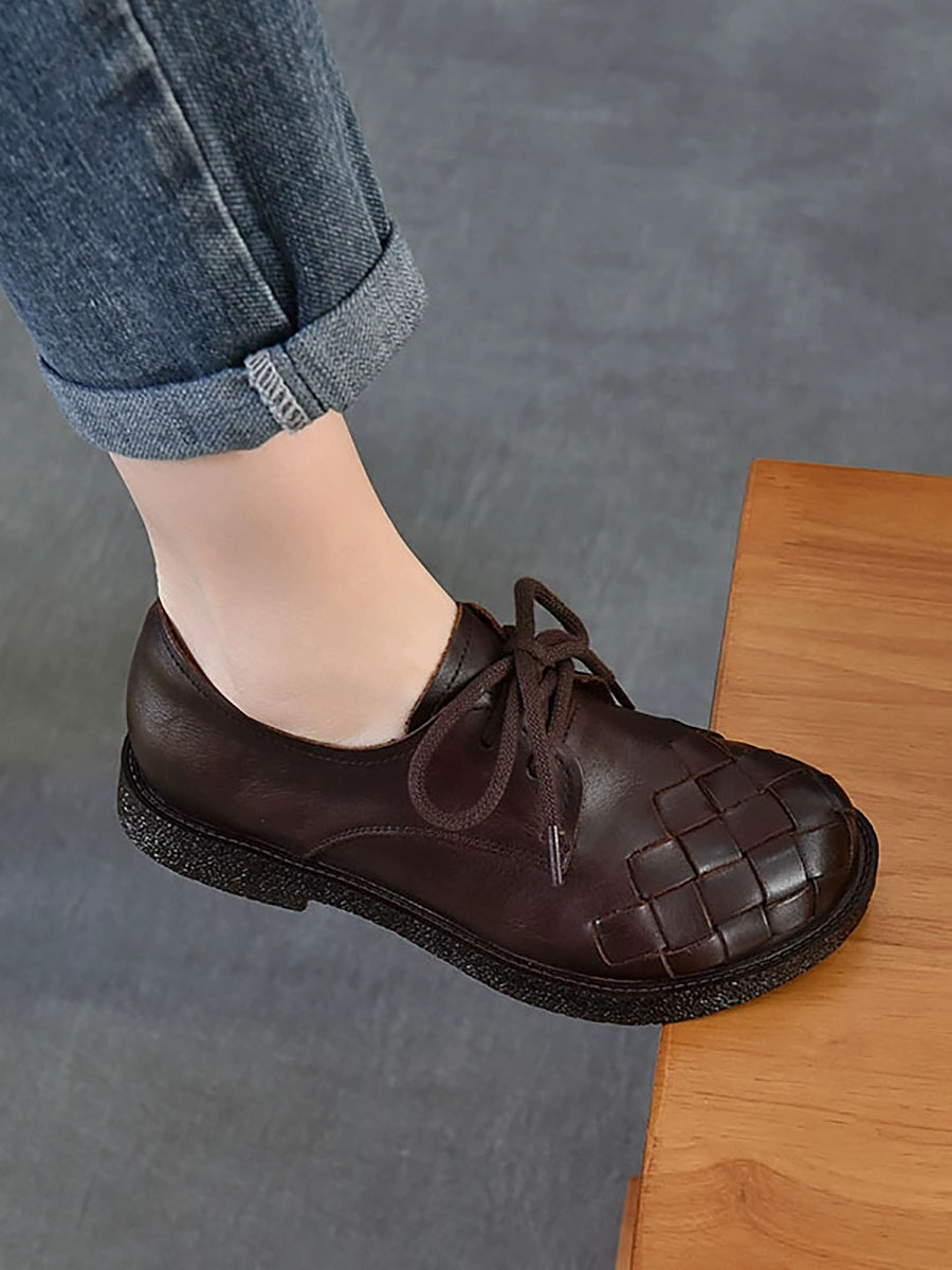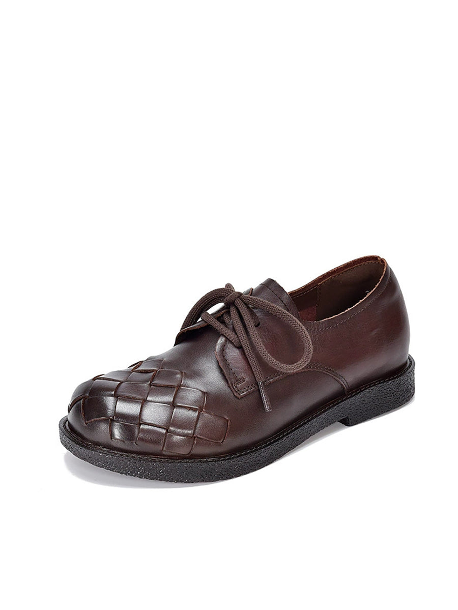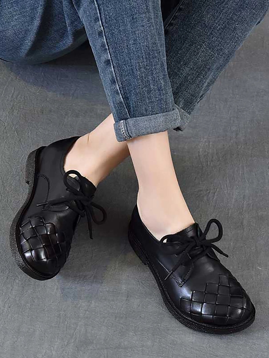 Sapatos femininos vintage de couro genuíno trançado com salto baixo