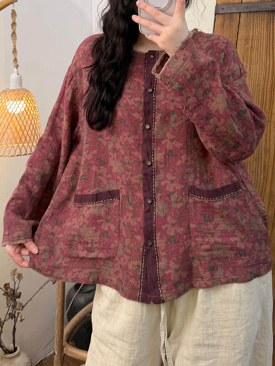 Camisa feminina vintage de primavera com estampa floral e gola redonda