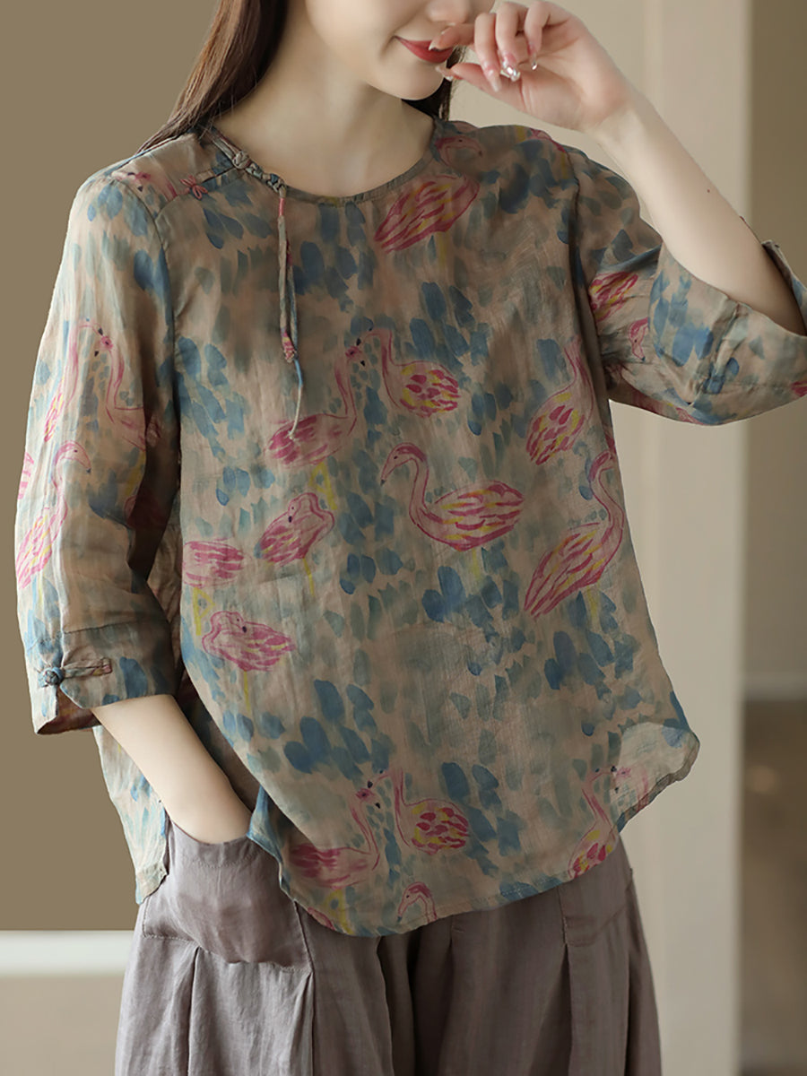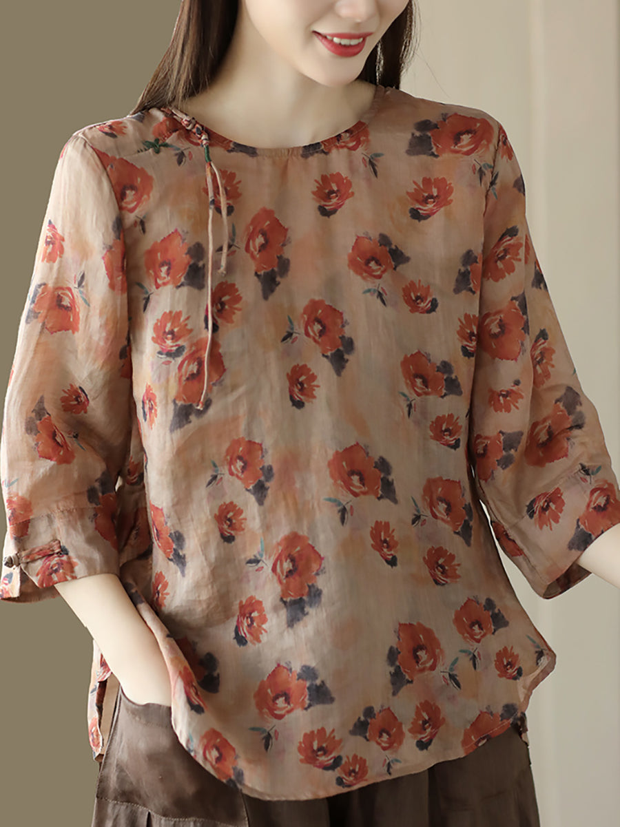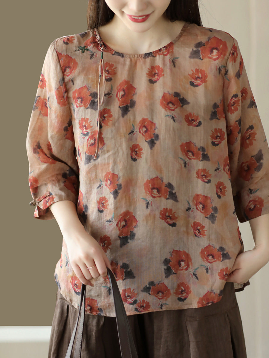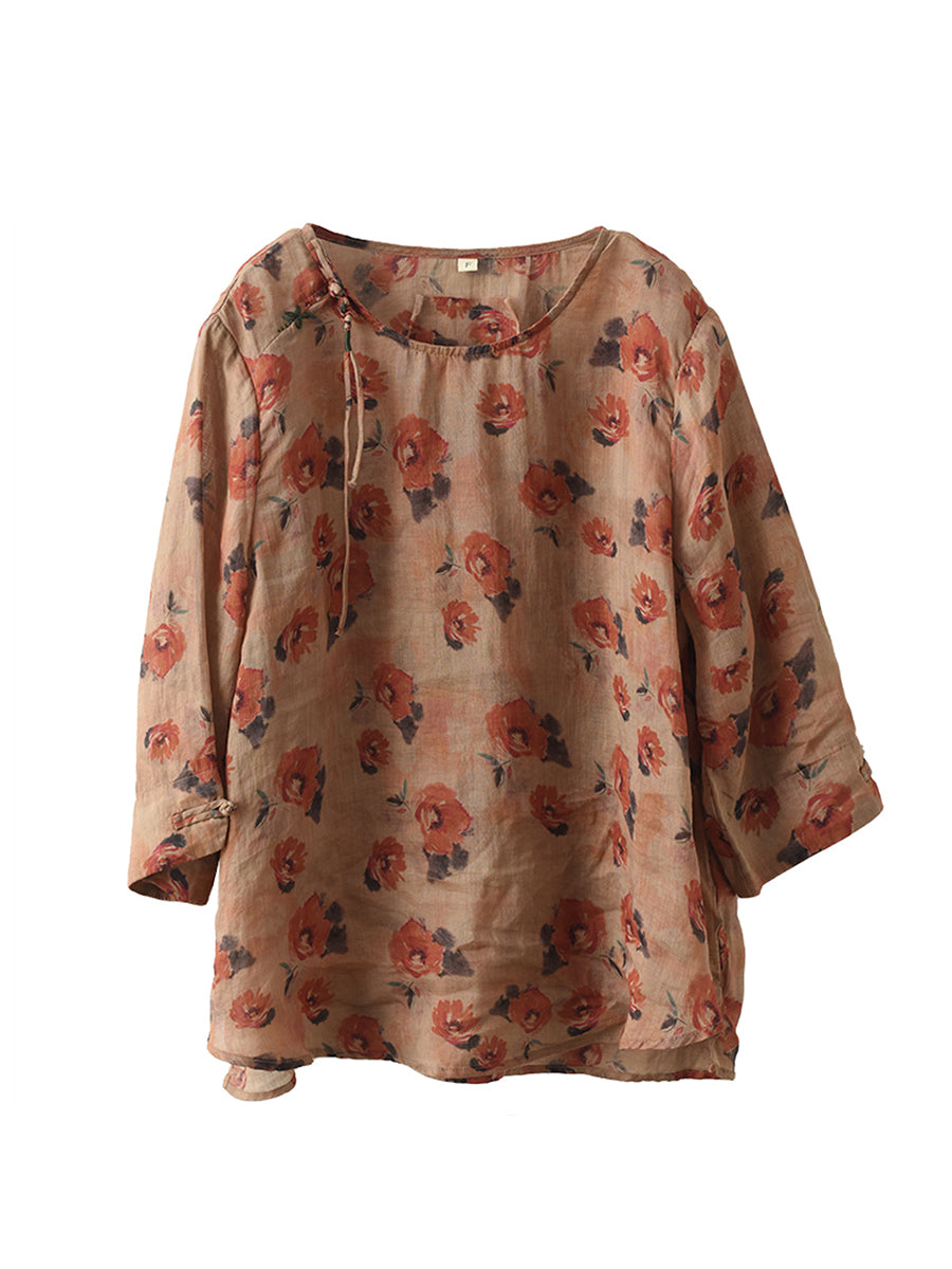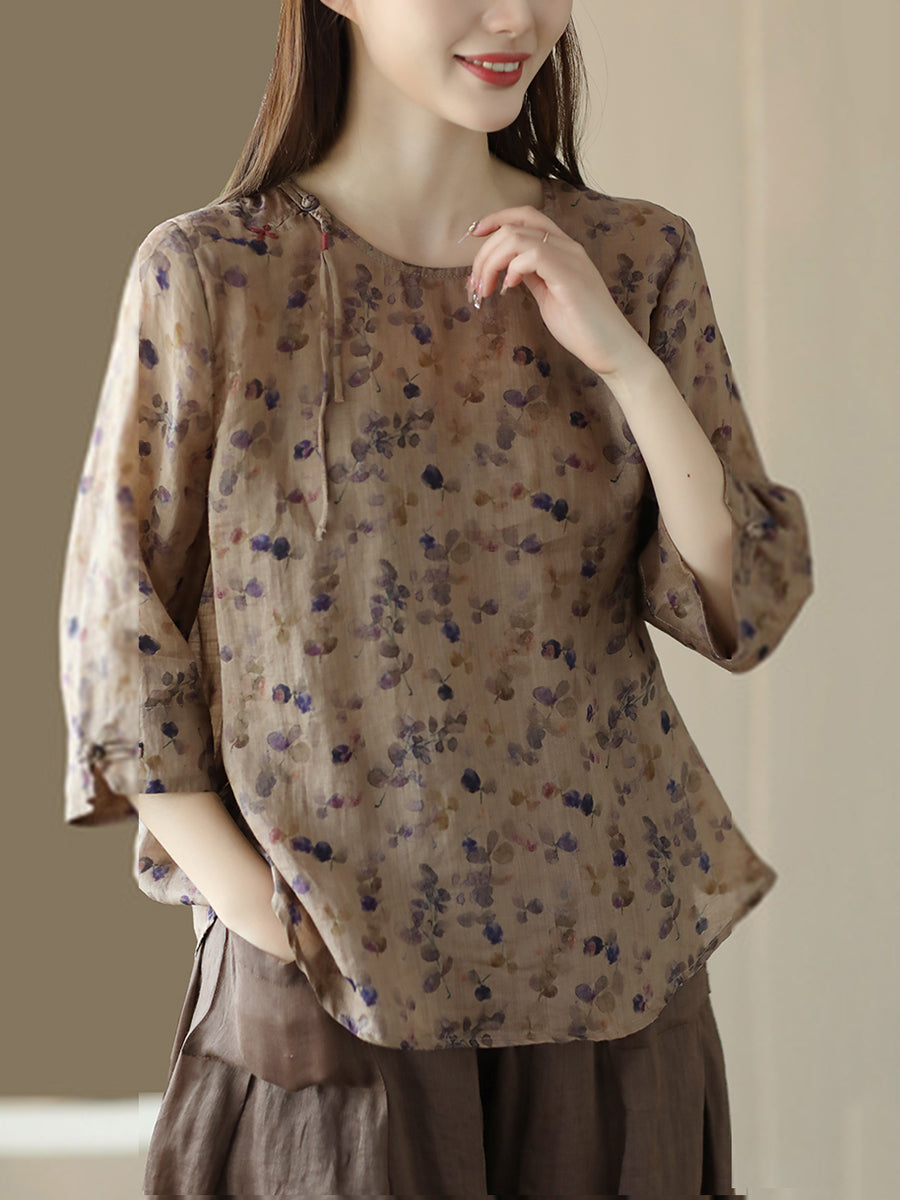 Mulheres Vintage Verão Floral Sapo Pulôver Camisa De Linho