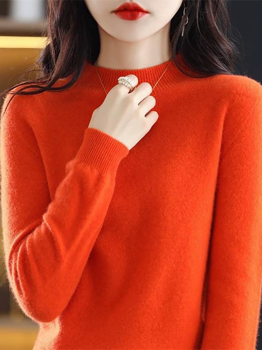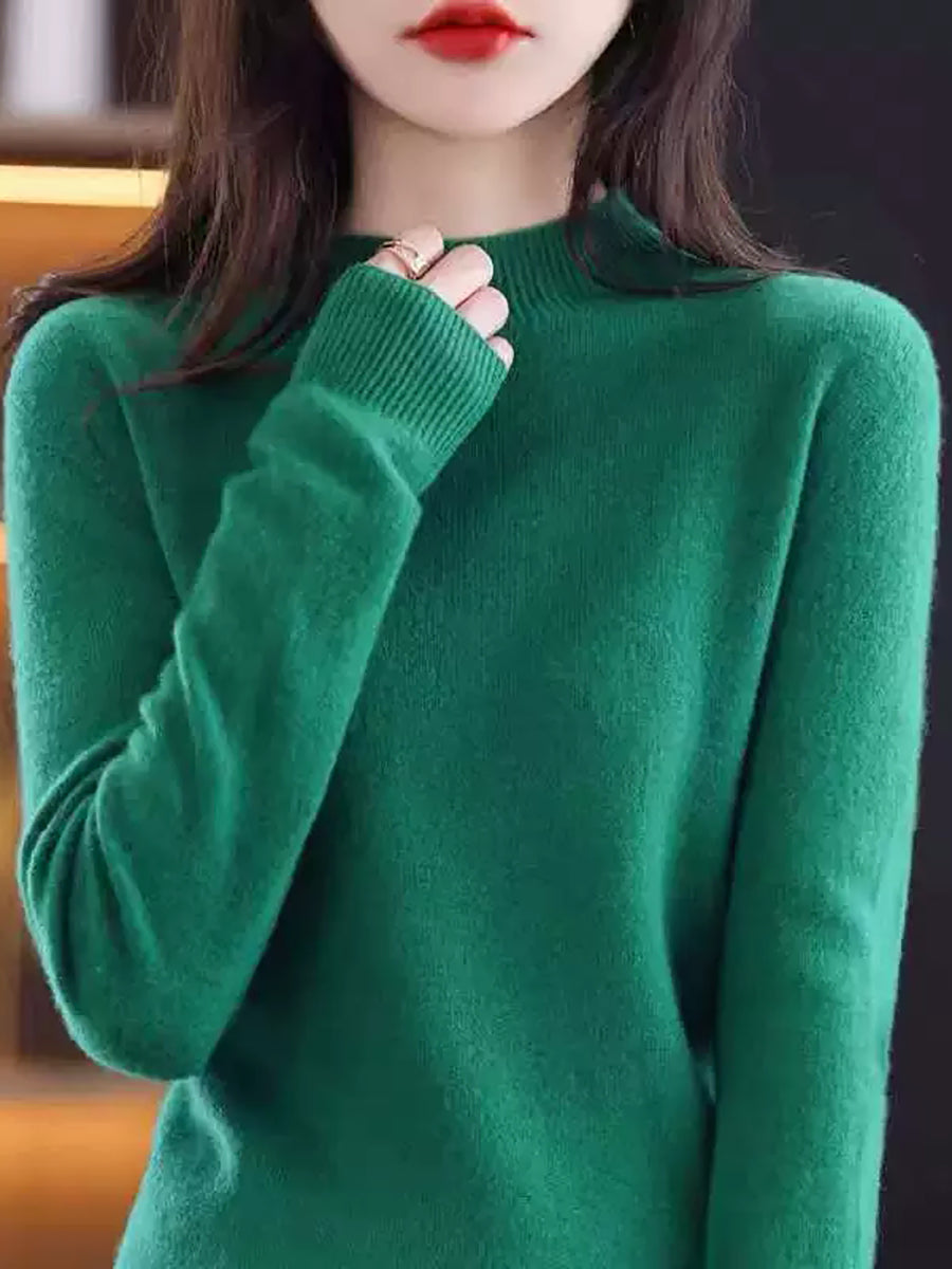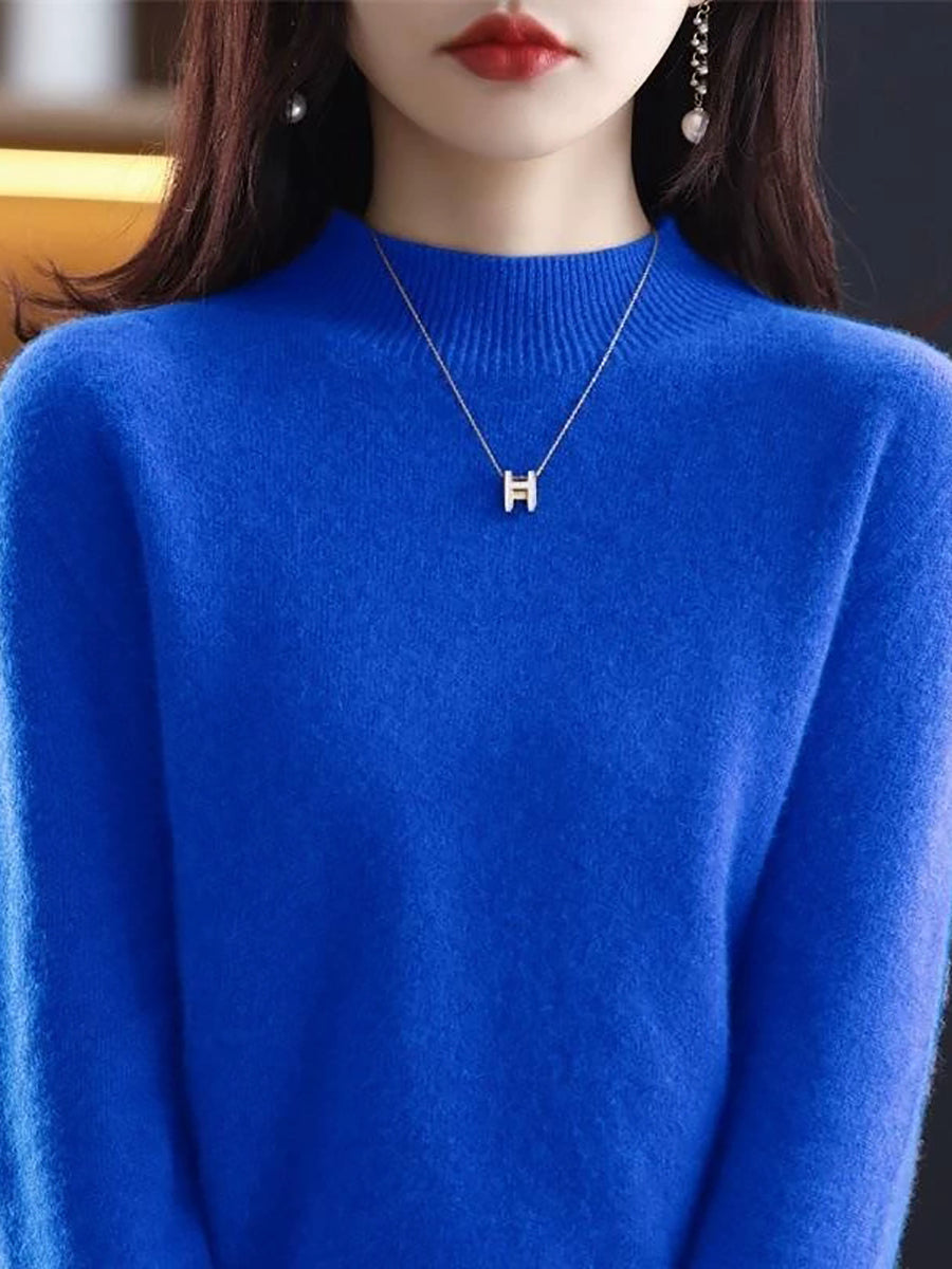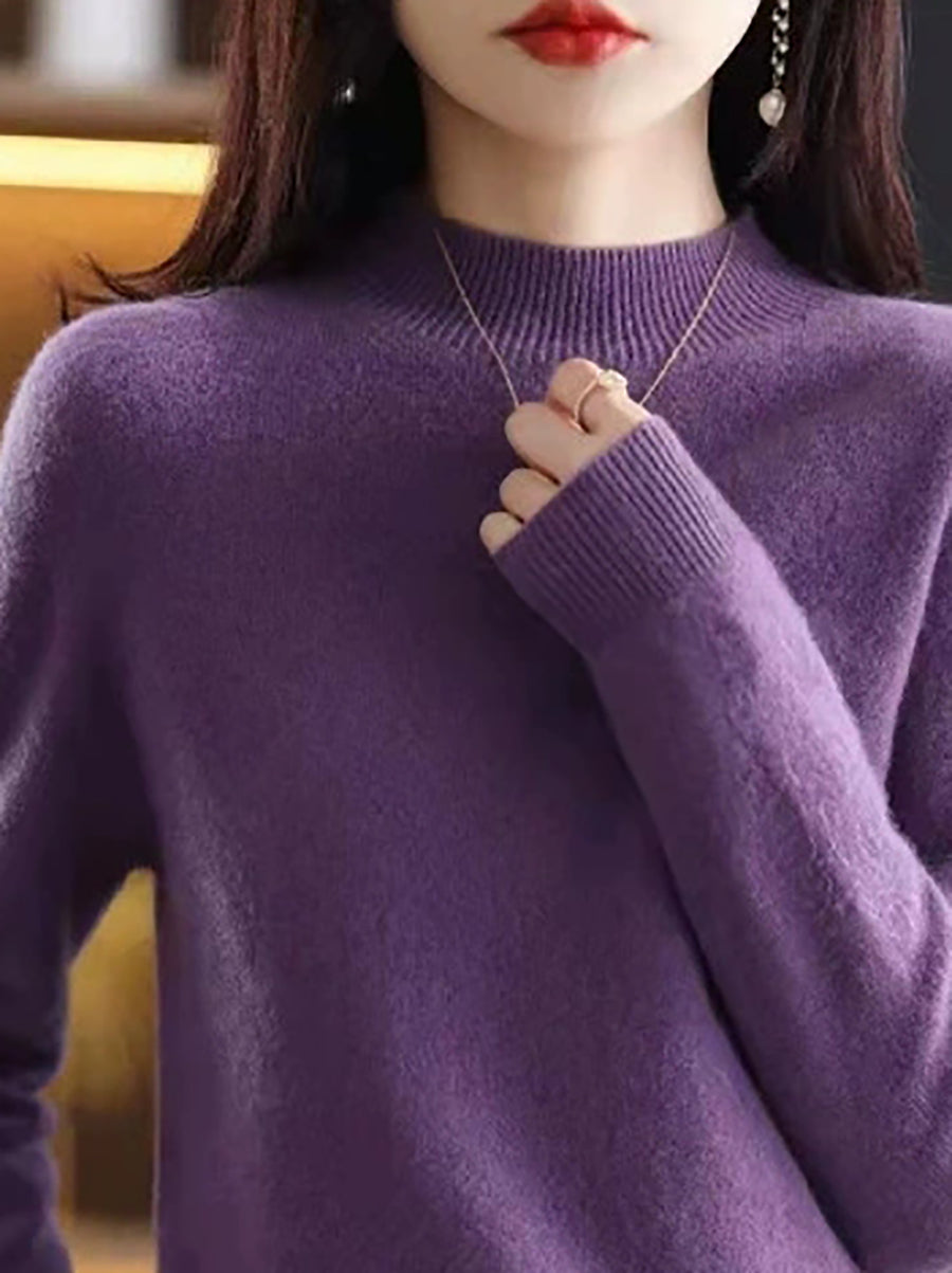Suéter feminino de inverno com gola alta e estampa artística em cores lisas.