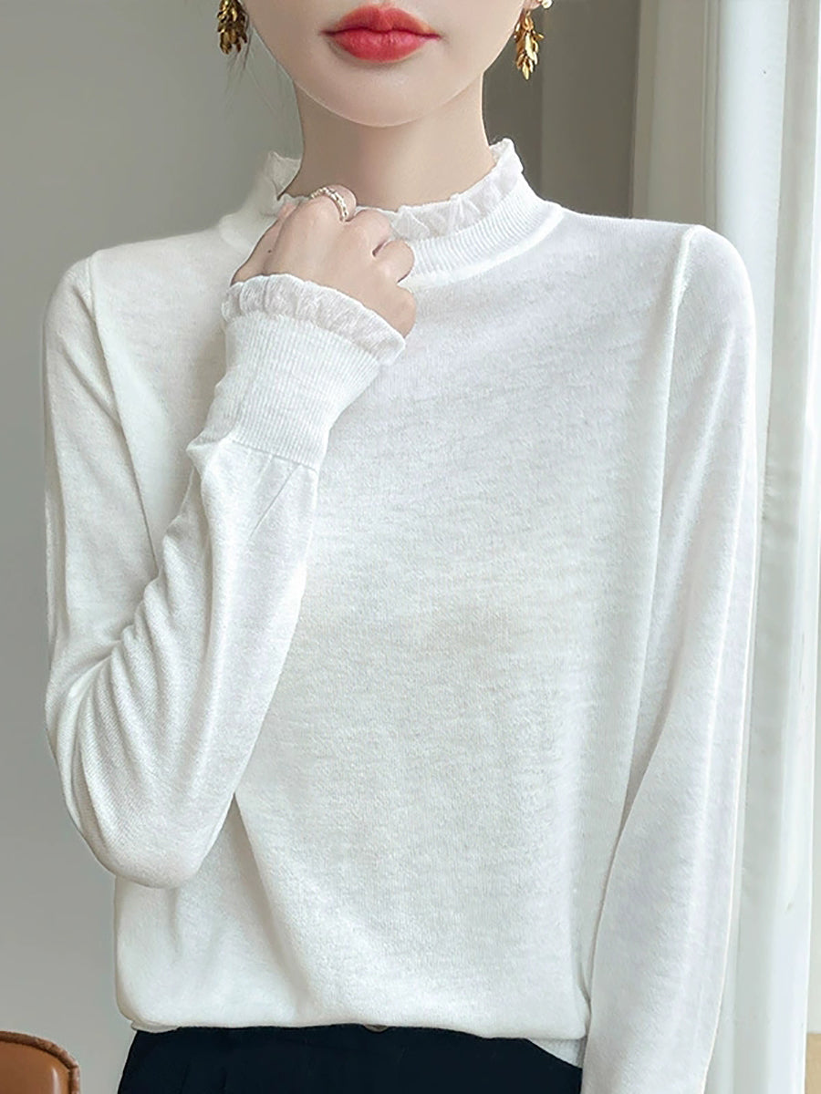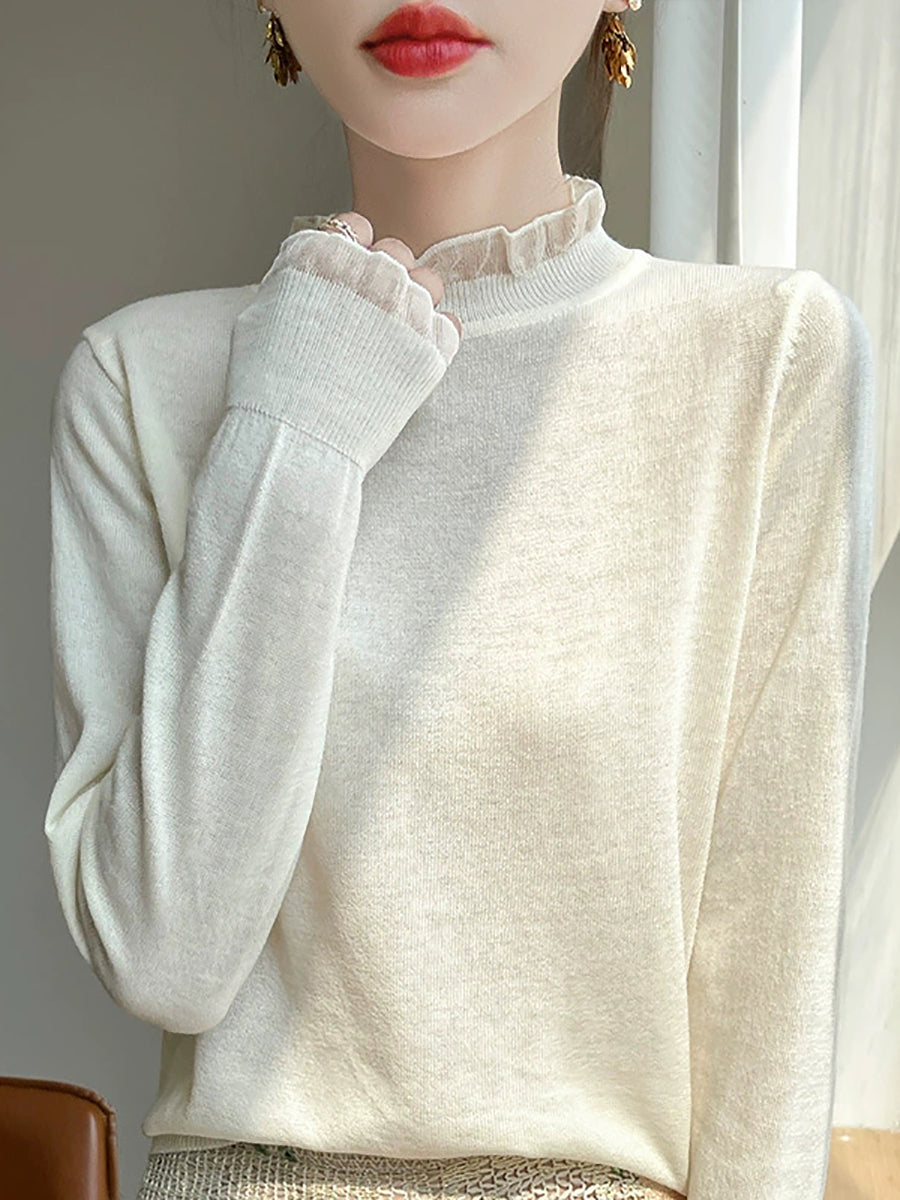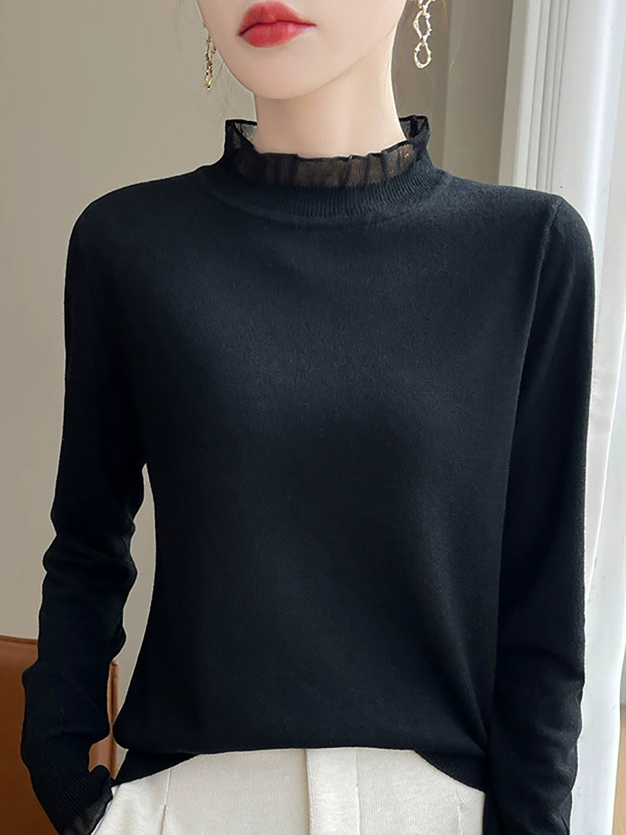 Suéter feminino de inverno com gola de renda em cor lisa e estilo artístico.
