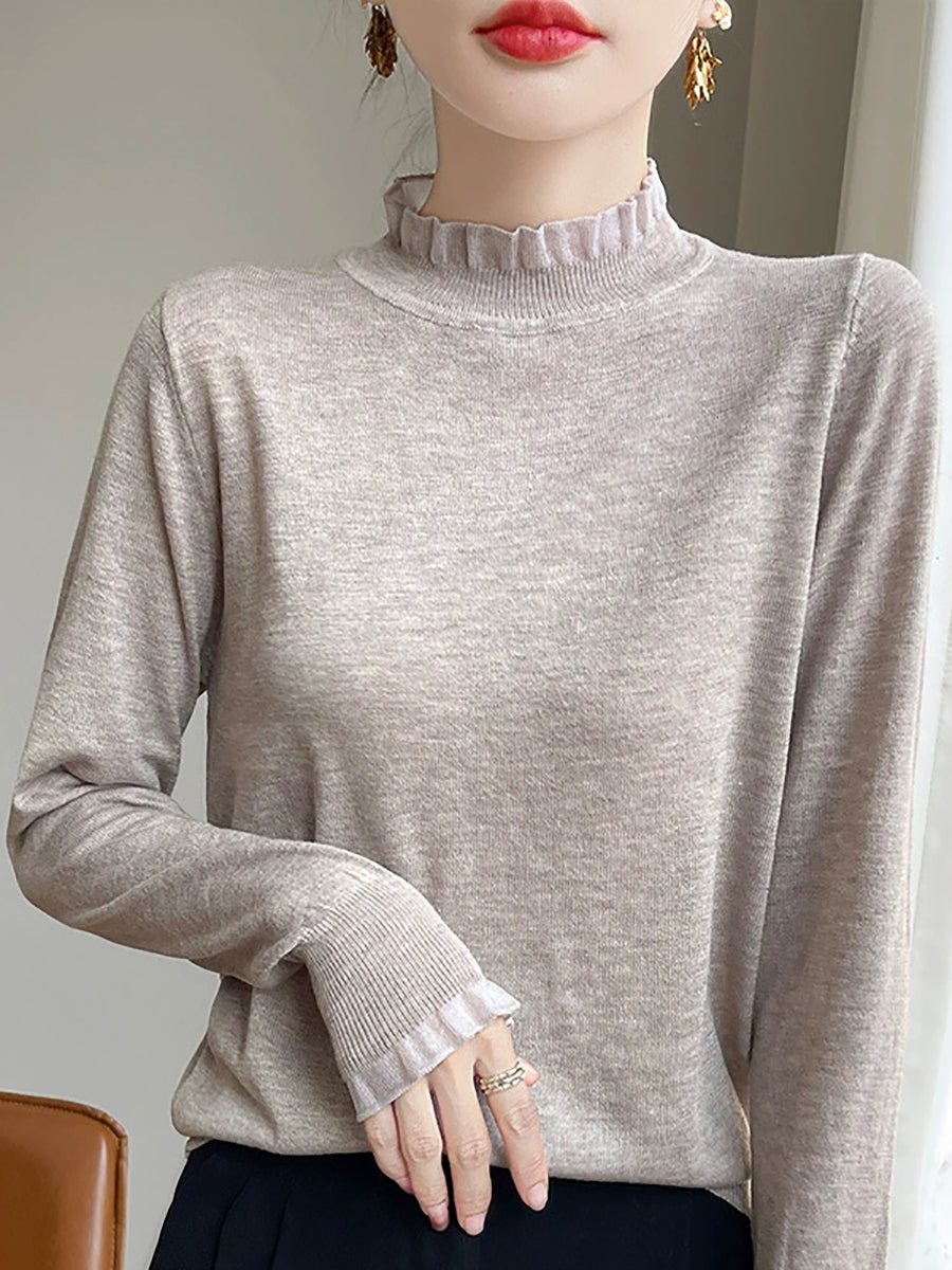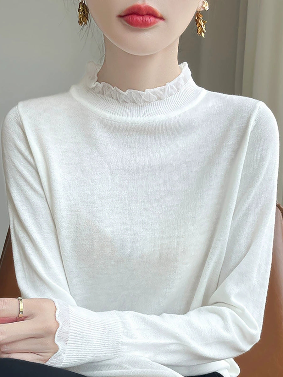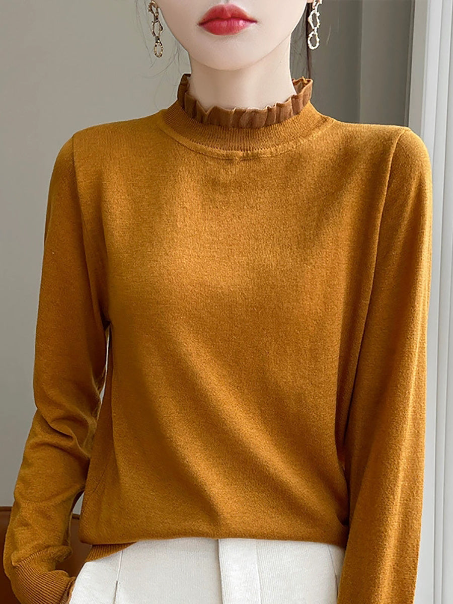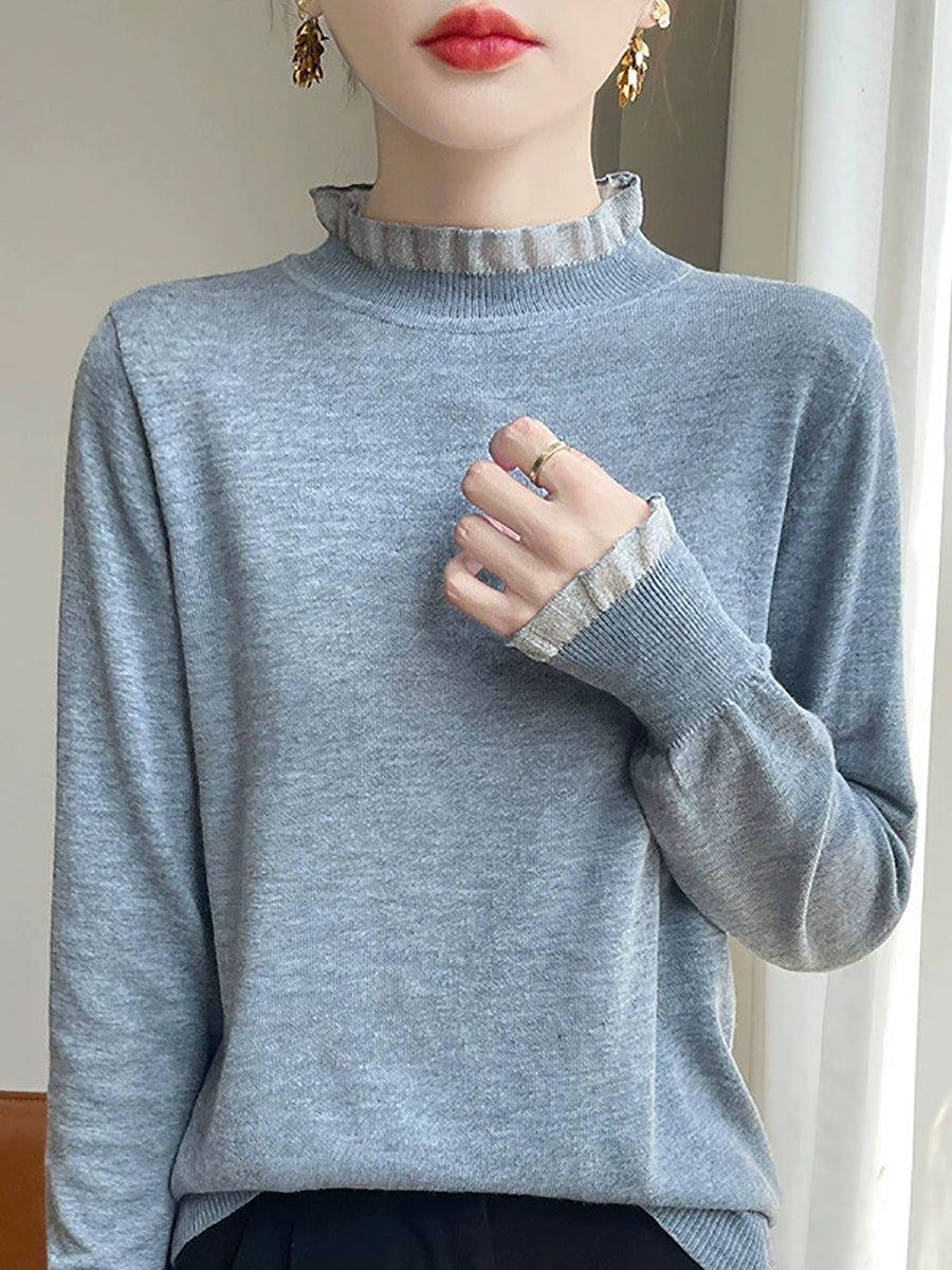 Suéter feminino de inverno com gola de renda em cor lisa e estilo artístico.