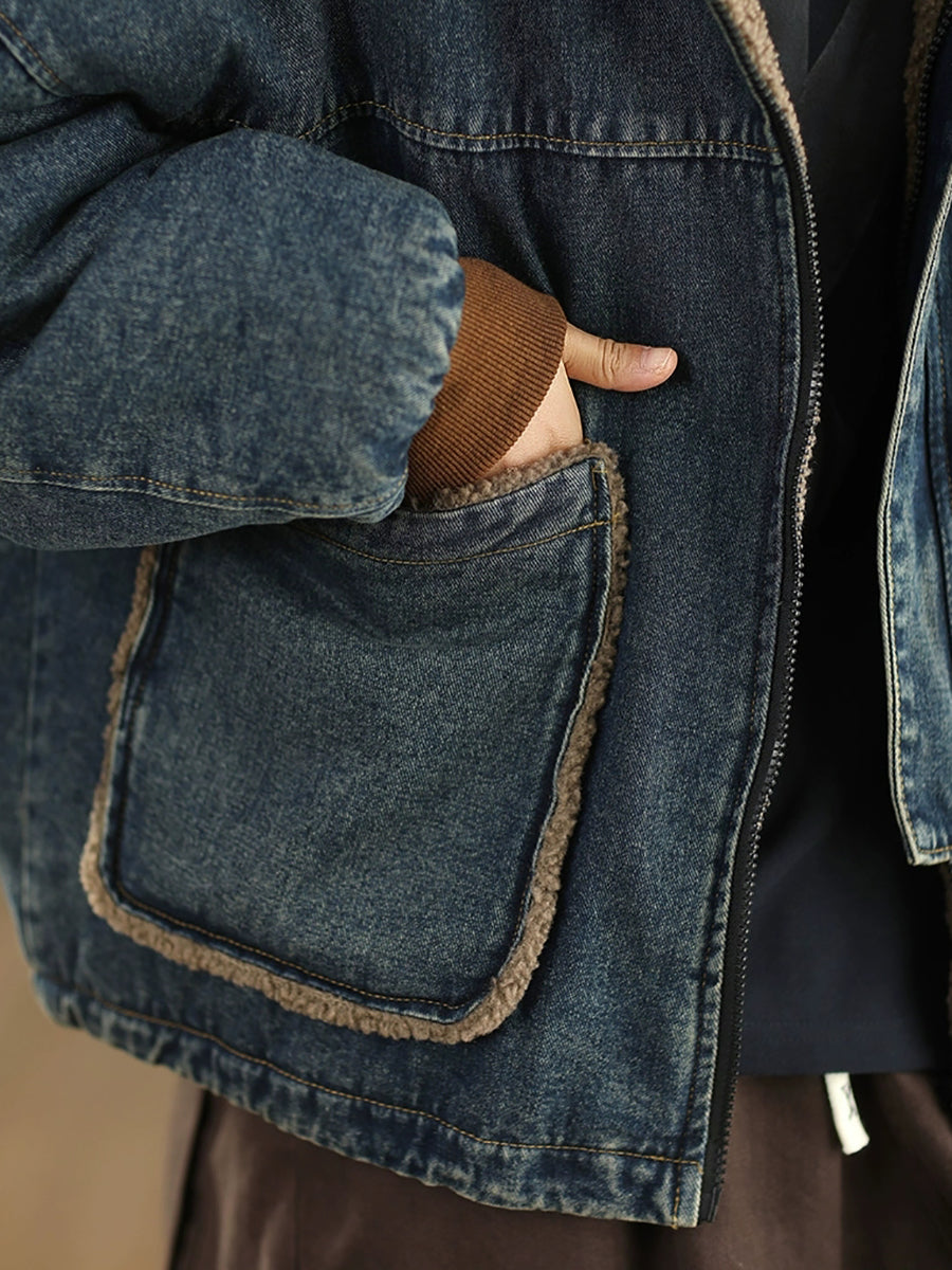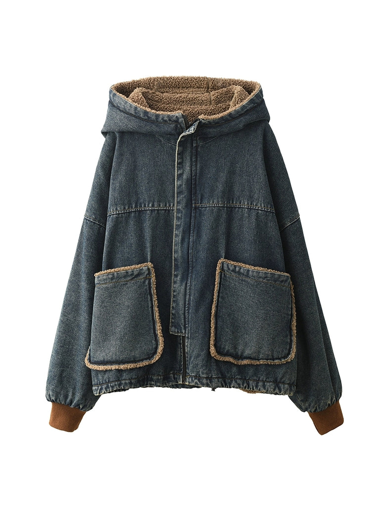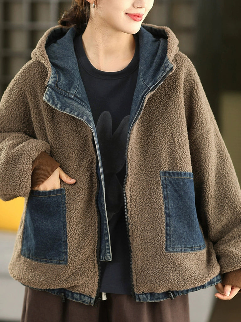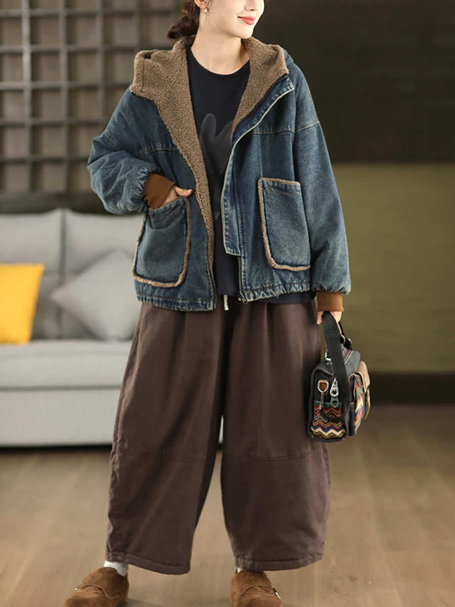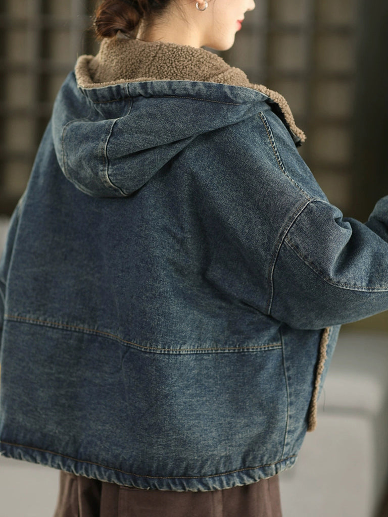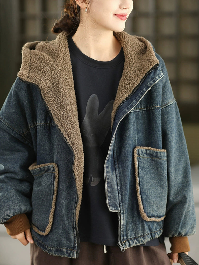 Casaco feminino de inverno com capuz em fleece e jeans, dupla face para usar.