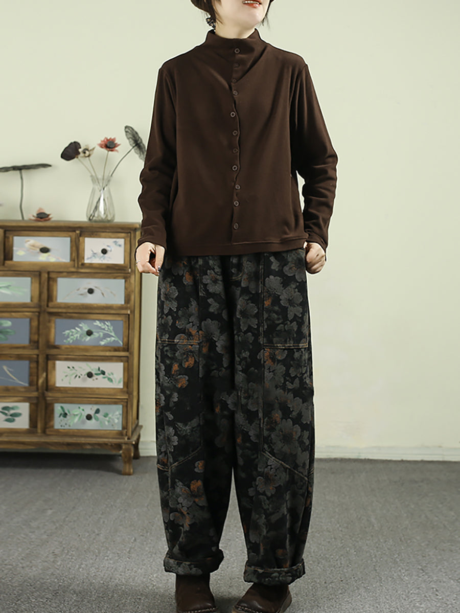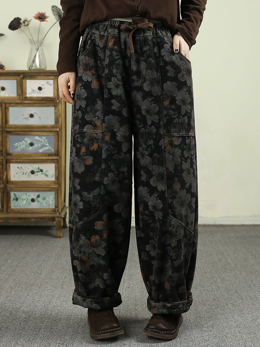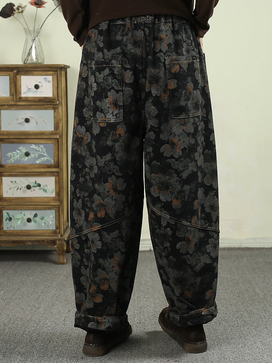 Calça Harem Feminina de Inverno em Jeans com Estampa Floral e Forro de Lã