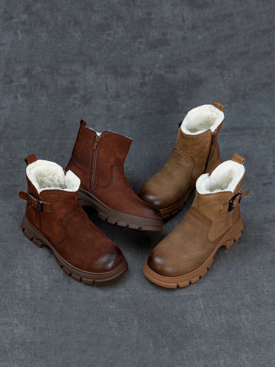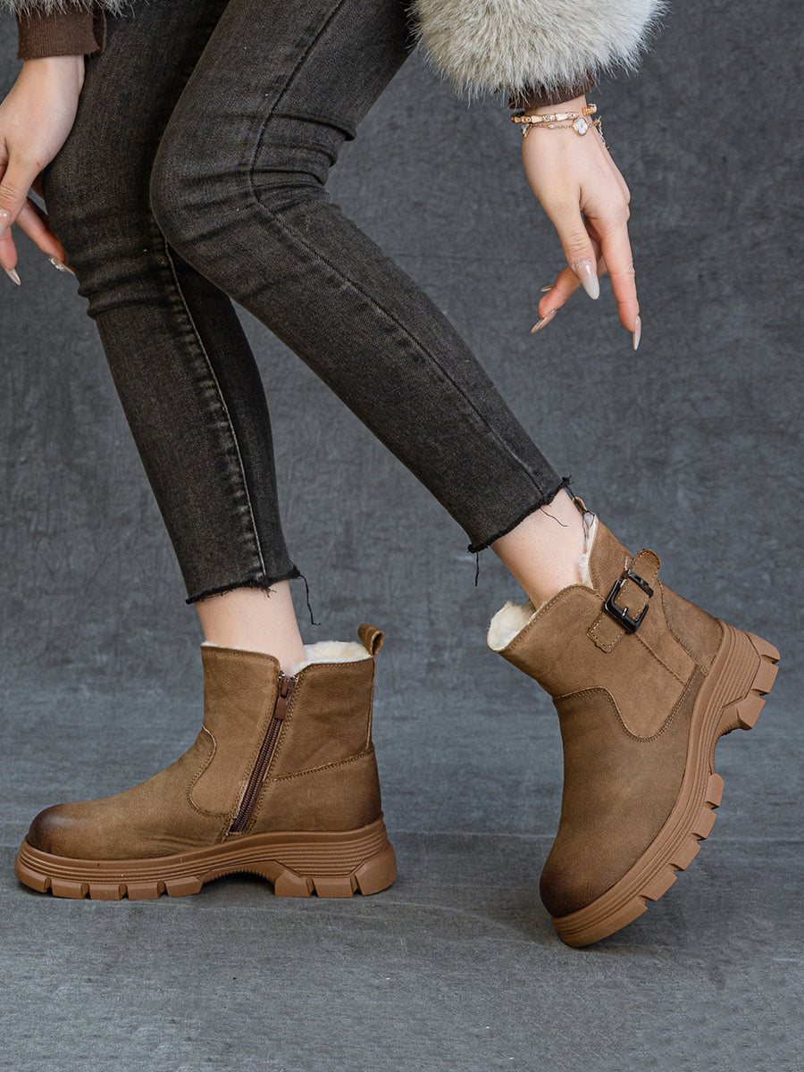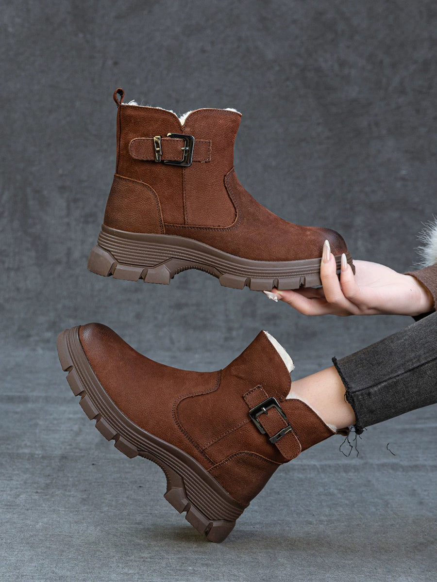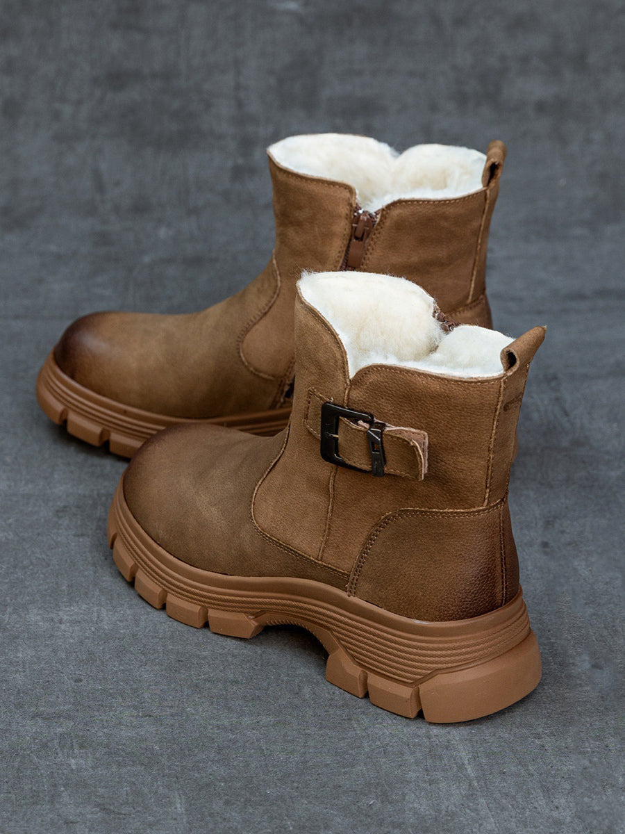 Botas de plataforma femininas de inverno em couro com forro de lã