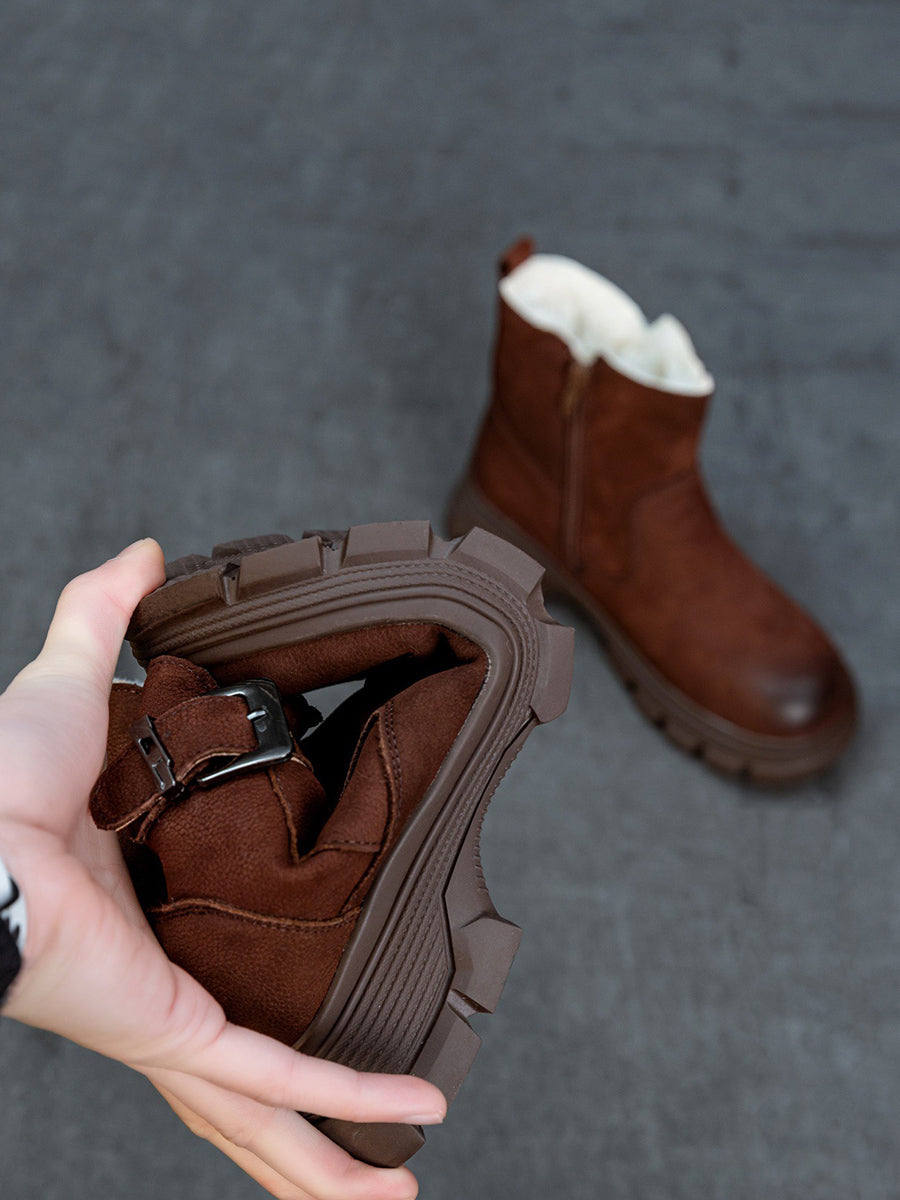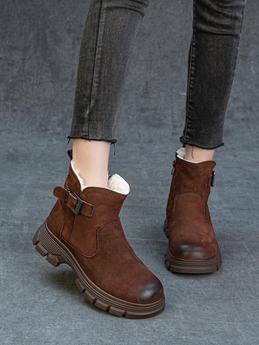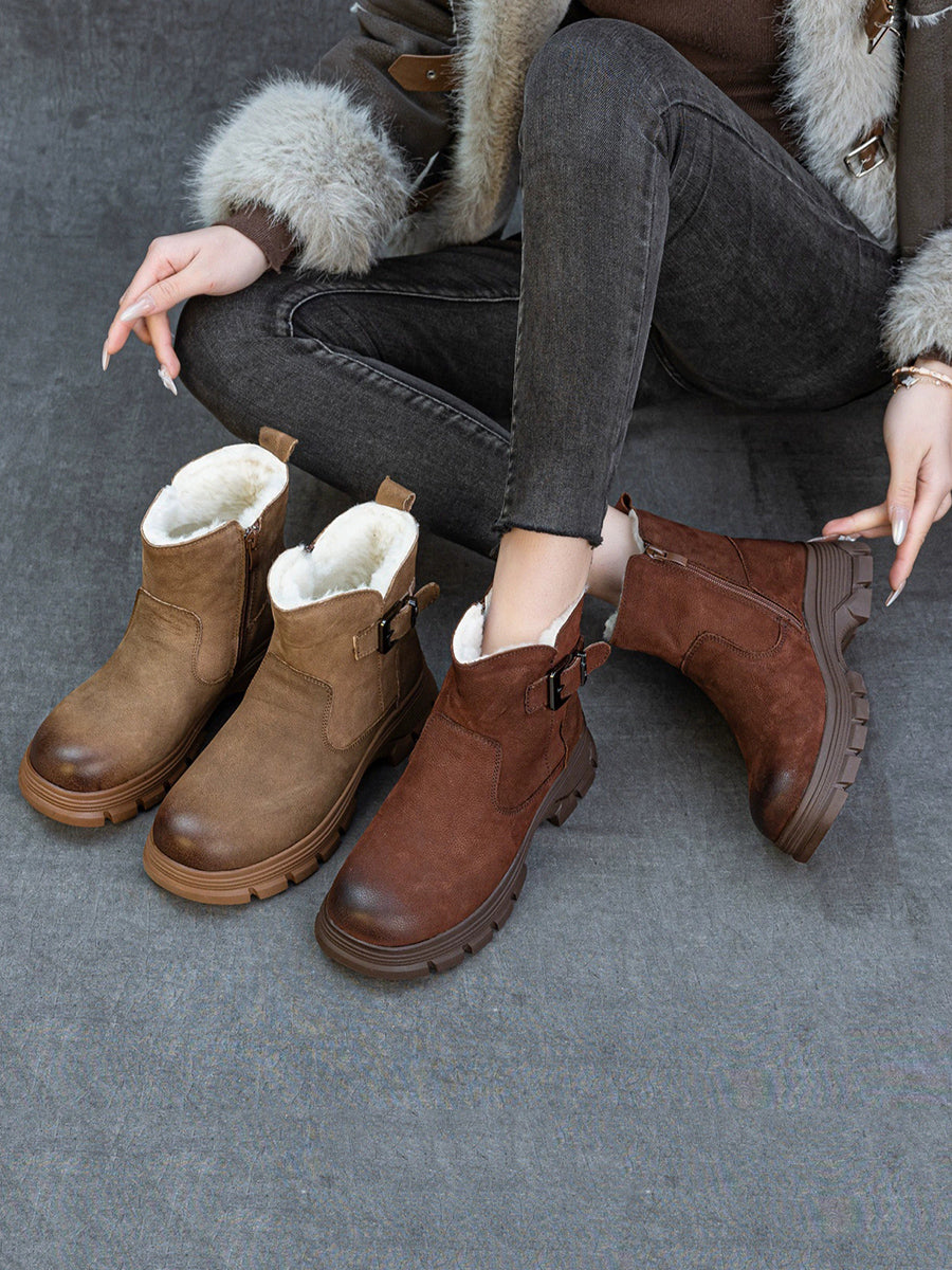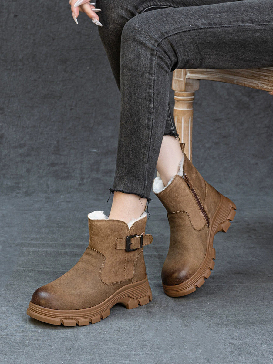 Botas de plataforma femininas de inverno em couro com forro de lã