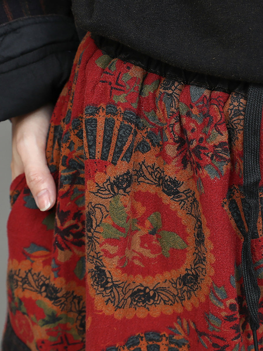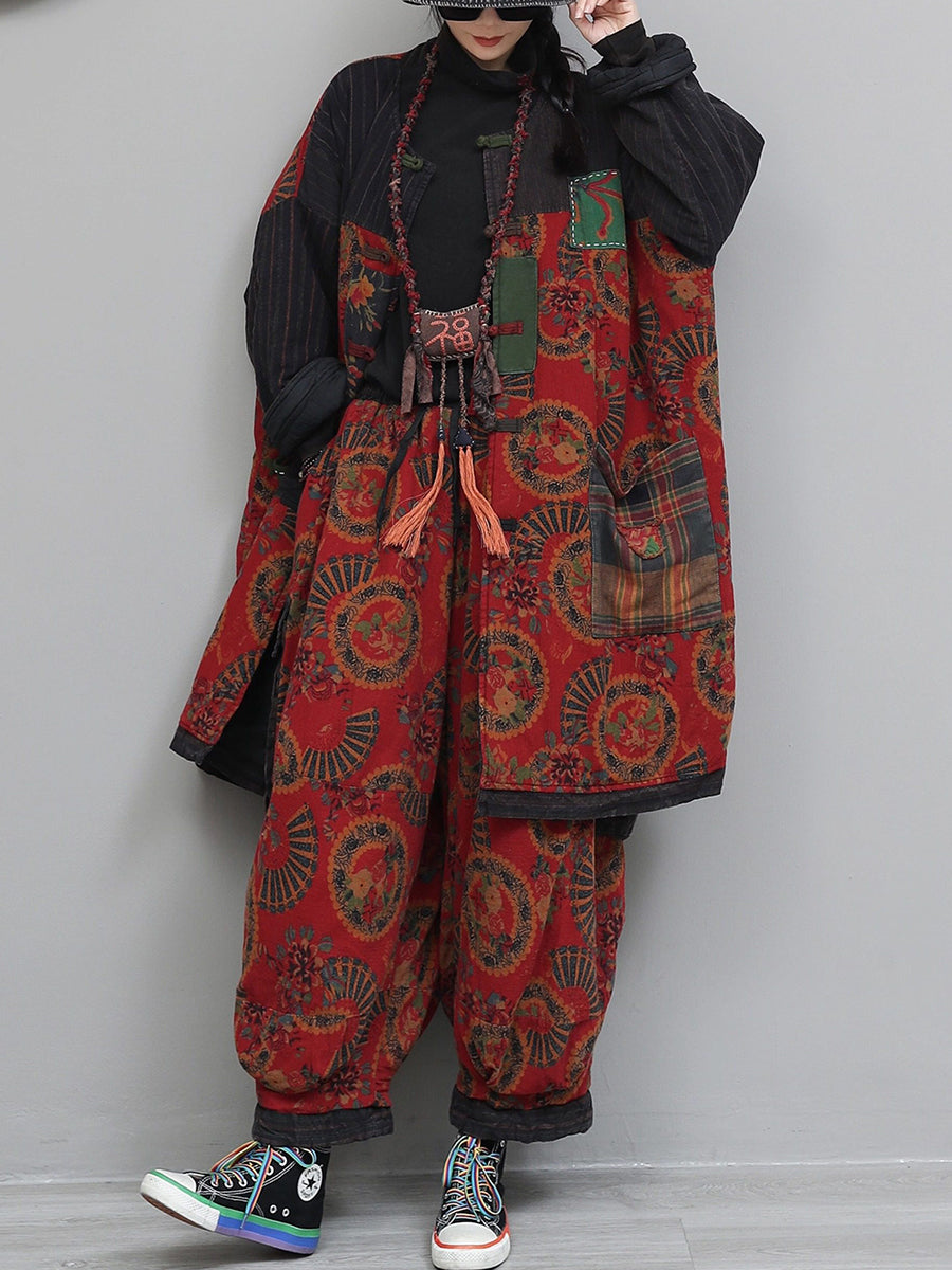 Conjunto feminino de inverno retrô com patchwork, gola redonda e bojo.