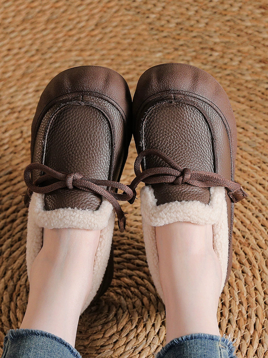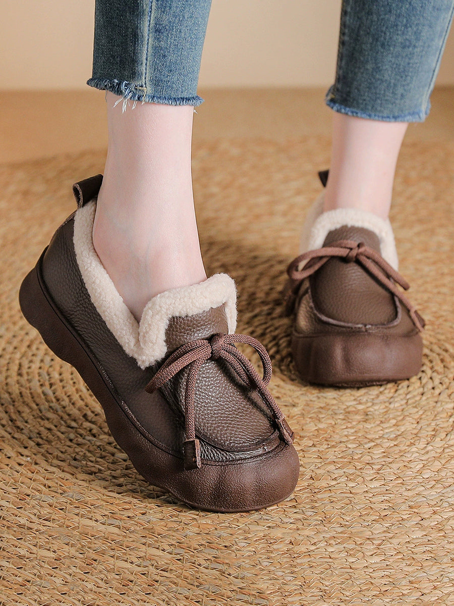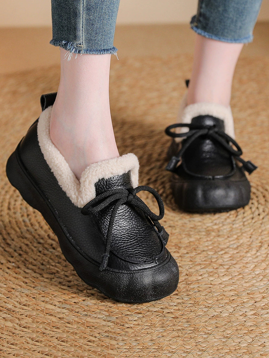 Sapatos femininos de inverno vintage em couro com forro de lã