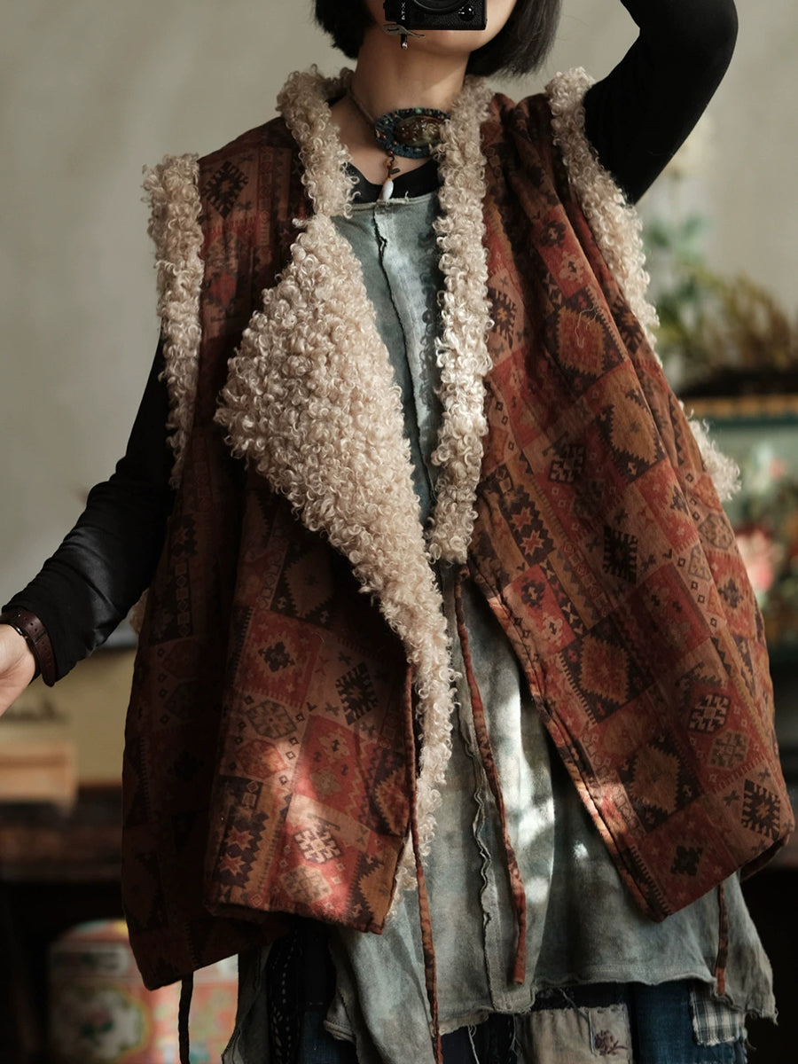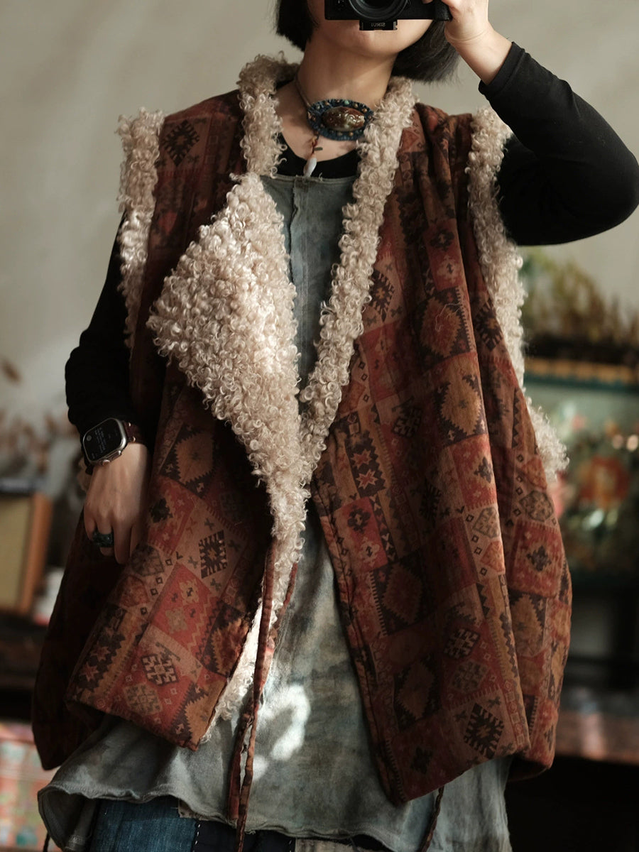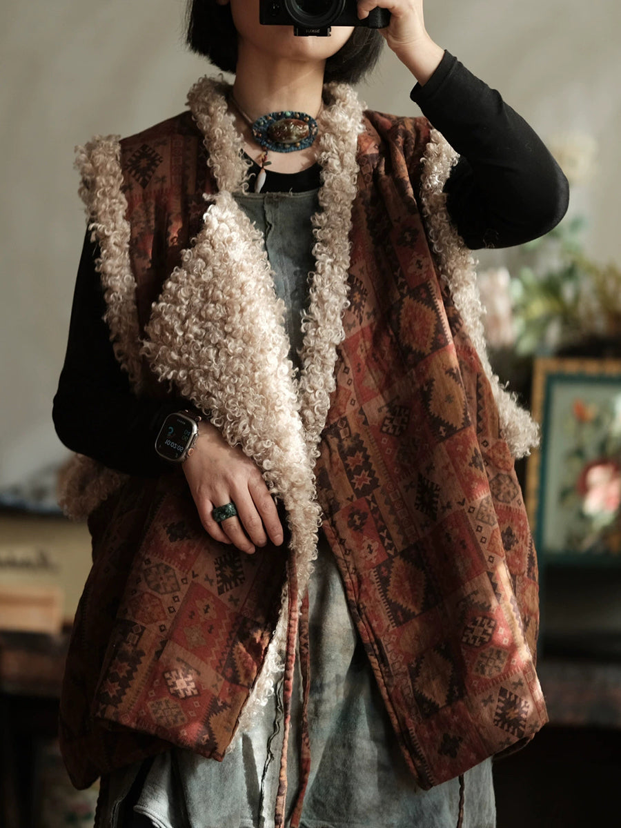 Colete feminino de inverno vintage patchwork com decote em V em fleece