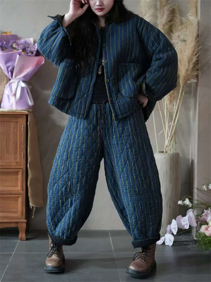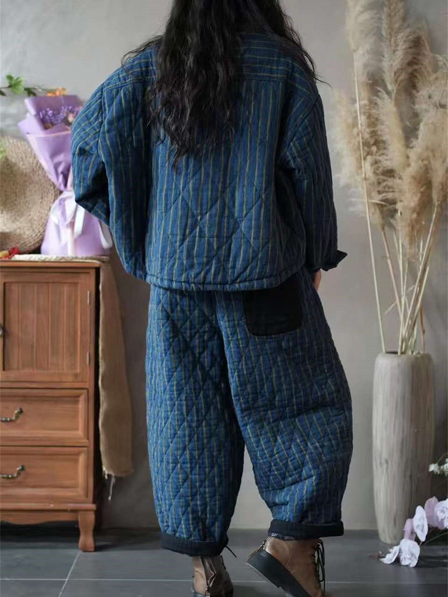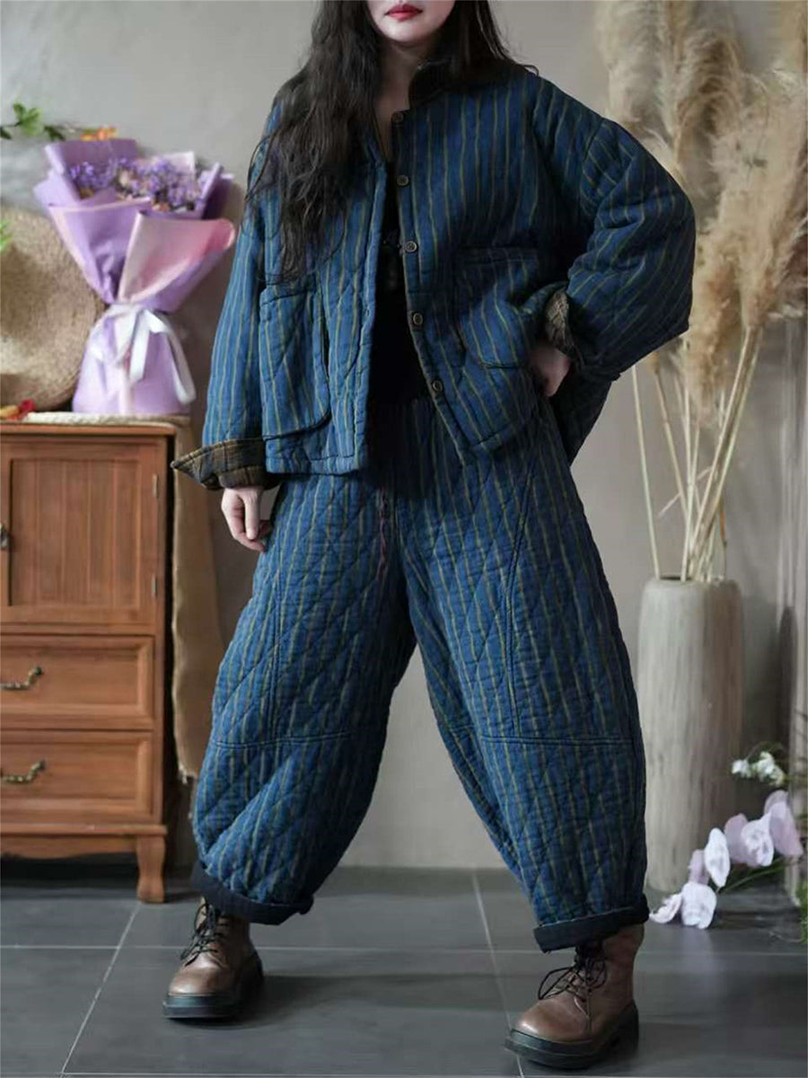 Conjunto feminino de inverno vintage com listras e acolchoado.